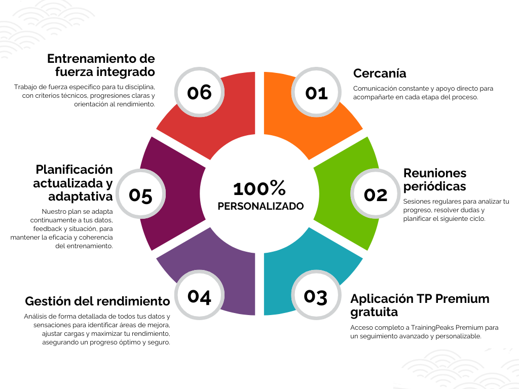 Te acompañaré en todo momento, analizando tu evolución y adaptando la planificación para optimizar tu rendimiento y mantener un progreso constante y sostenible.